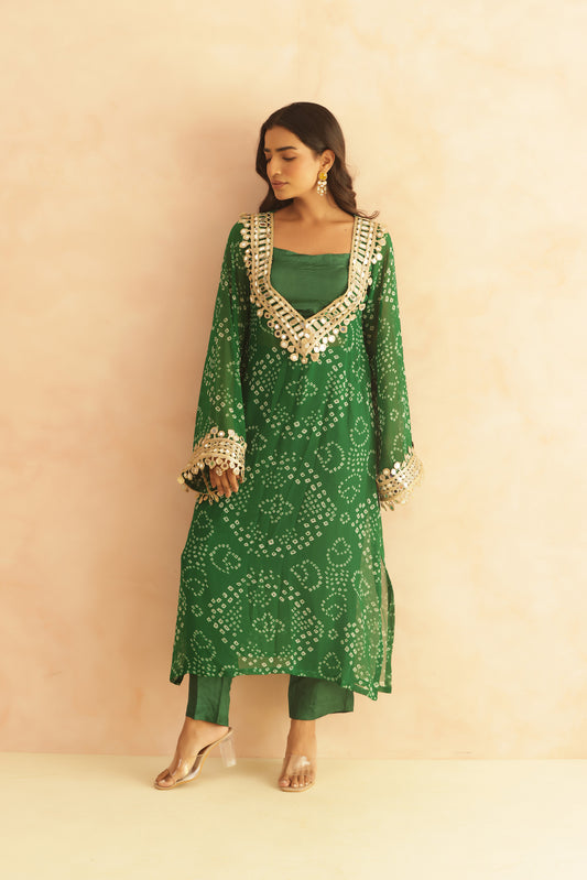 EDITHA GREEN BANDHEJ MIRROR LACE WORK FUSION SET