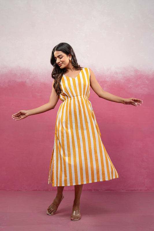 DITI YELLOW STRIPED CINCHED WAIST A-LINE DRESS