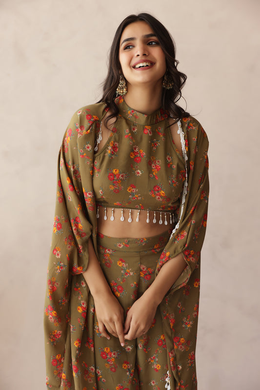 MANVI OLIVE GREEN MULMUL FLORAL SHRUG SET