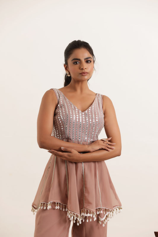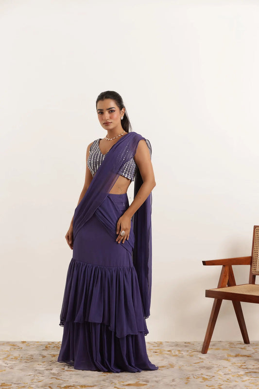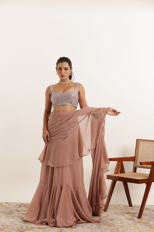 AMEERA MAUVE CHIKU RUFFLE PRE DRAPED LEHENGA SAREE SET