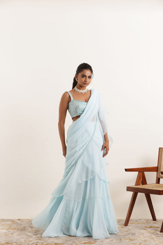 ANOUSHKA POWDER BLUE RUFFLE LEHENGA SAREE