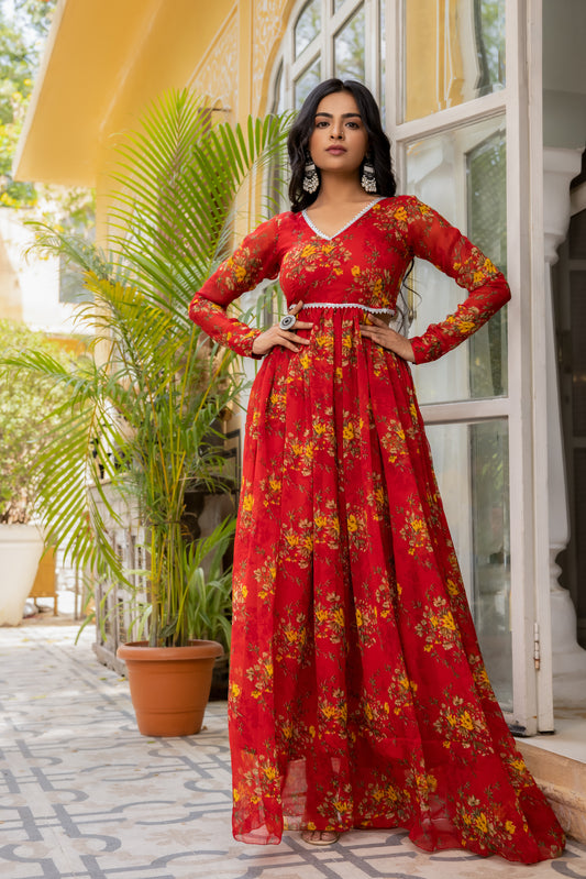 REA RED FLORAL PRINTED GOWN WITH SLITS ON WAIST