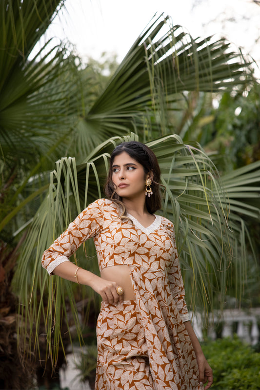 EISHAL COTTON MUSTARD YELLOW LEAF PRINTED KURTA SET