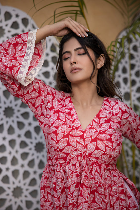 Sold outSHEEN RED COTTON LEAF PRINTED DRESS